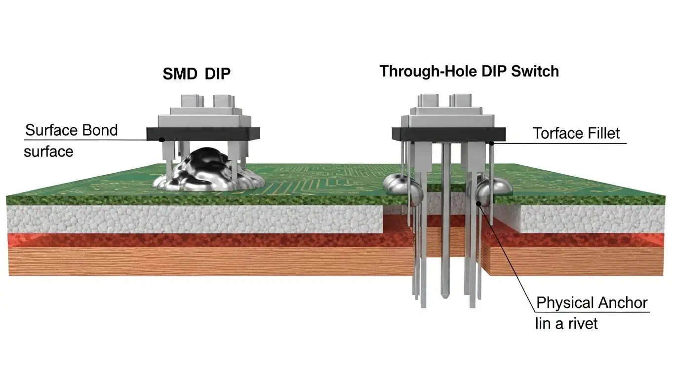 Engineer’s Note: While THT feels stronger, modern SMD switches often include "retention pegs" or ground pads to add mechanical stability without requiring a full through-hole process.