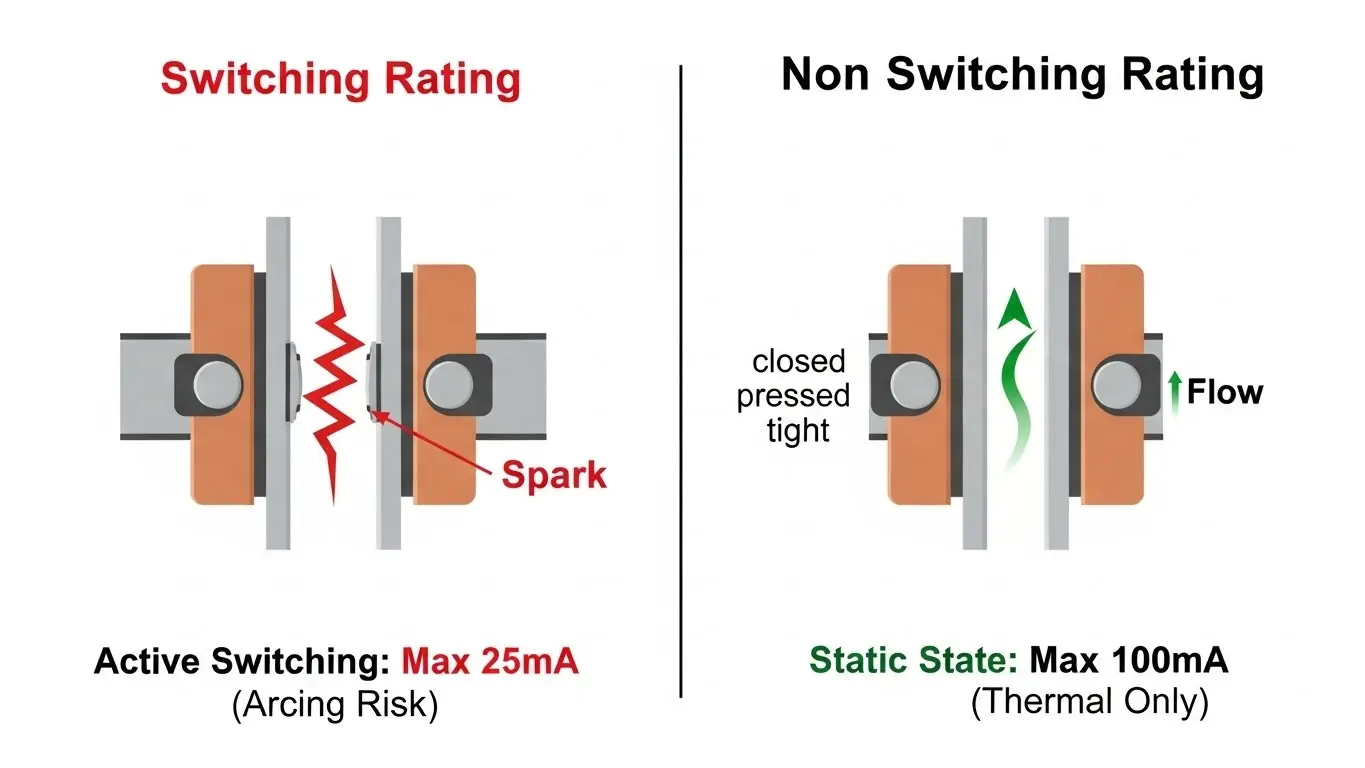 - The Physics: Once the contacts are physically locked together, there is no arcing risk. The limit is now determined purely by thermal rise (resistive heating). The contact mass can safely conduct 100mA without melting the plastic housing.