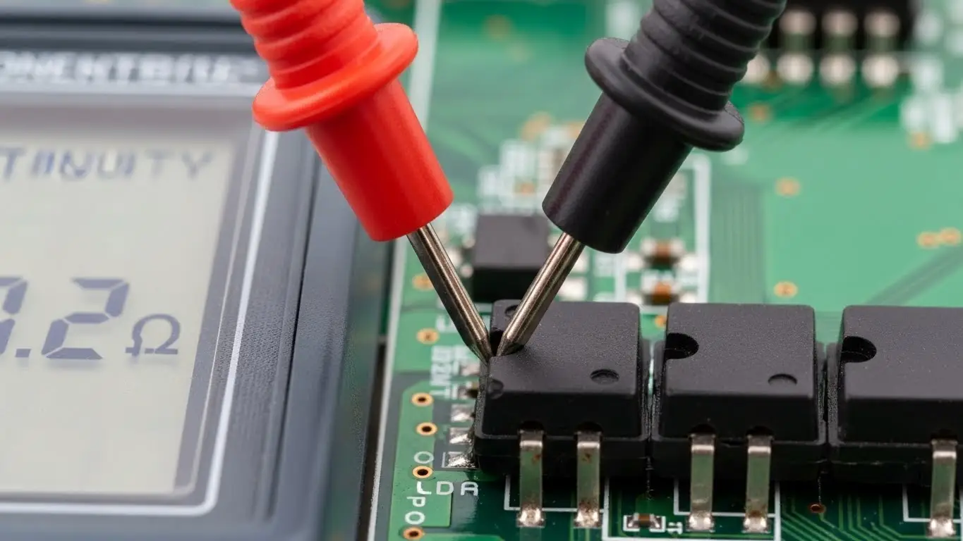 [Image Suggestion: A close-up photo of a multimeter probe touching the legs of a DIP switch on a green PCB, showing a reading on the screen. Alt Text: Technician testing DIP switch continuity with a digital multimeter.]