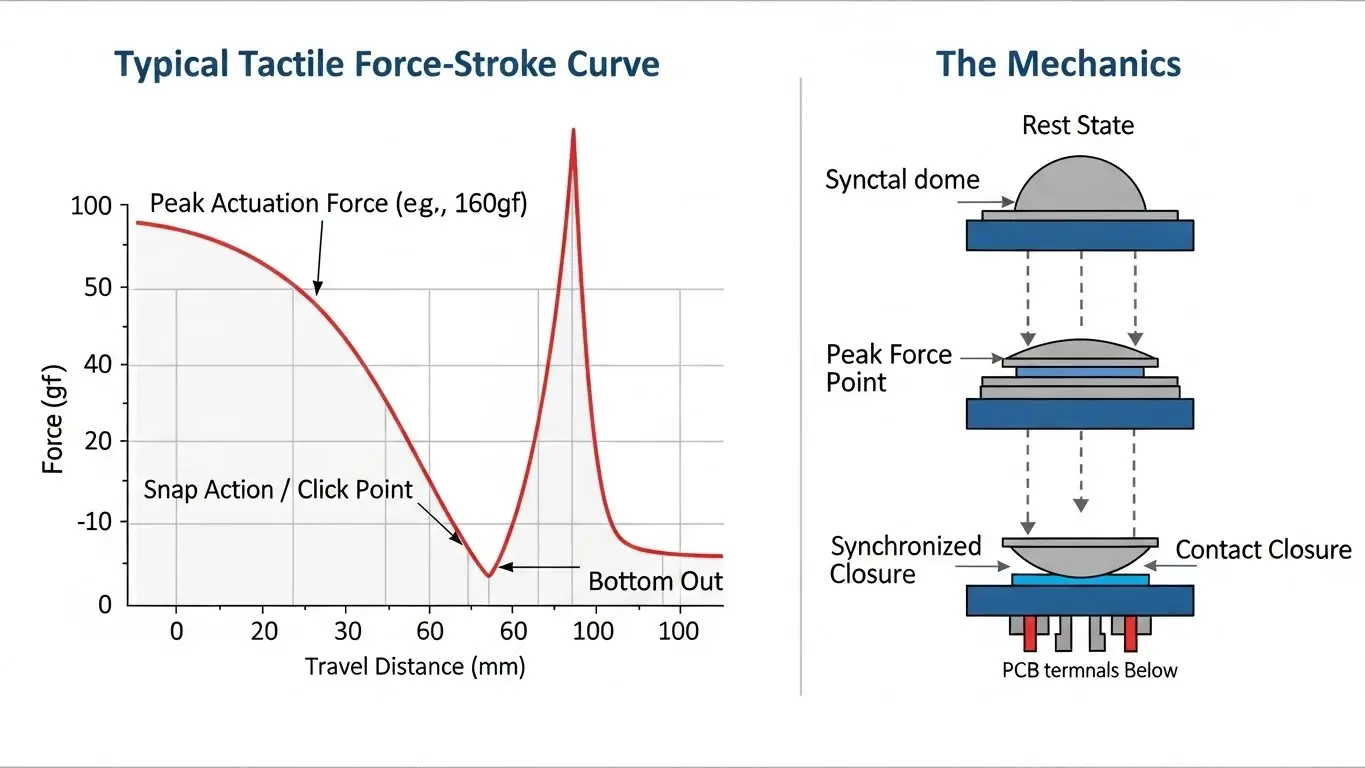 - The Pre-Travel Phase: As your finger touches the plunger, the resistance increases linearly. The dome is bending but hasn't buckled yet.