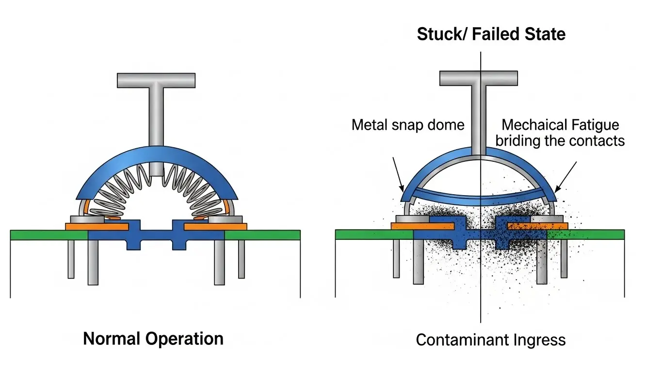 - Mechanical Fatigue: The metal snap dome inside the switch loses its elasticity or fractures, leading to a "mushy" feel and permanent closure.