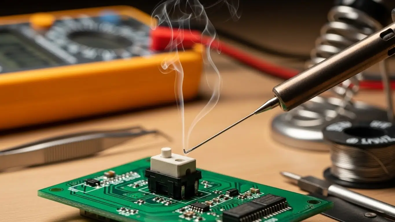 Before heating up your iron, ensure you have the right equipment. Installing a tactile switch requires precision because the plastic housing can easily melt if exposed to excessive heat.