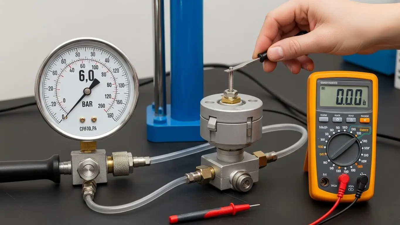 To calibrate accurately, you cannot rely on the process pressure alone. You need a controlled environment: a test pump, a reference pressure gauge, and a multimeter (set to continuity/beep mode).