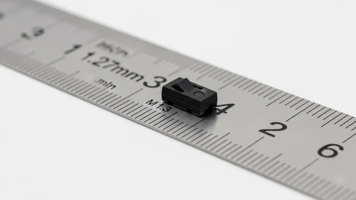 Alt Text: Close-up comparison of a black 1.27mm pitch Micro DIP switch next to a ruler showing its tiny scale.