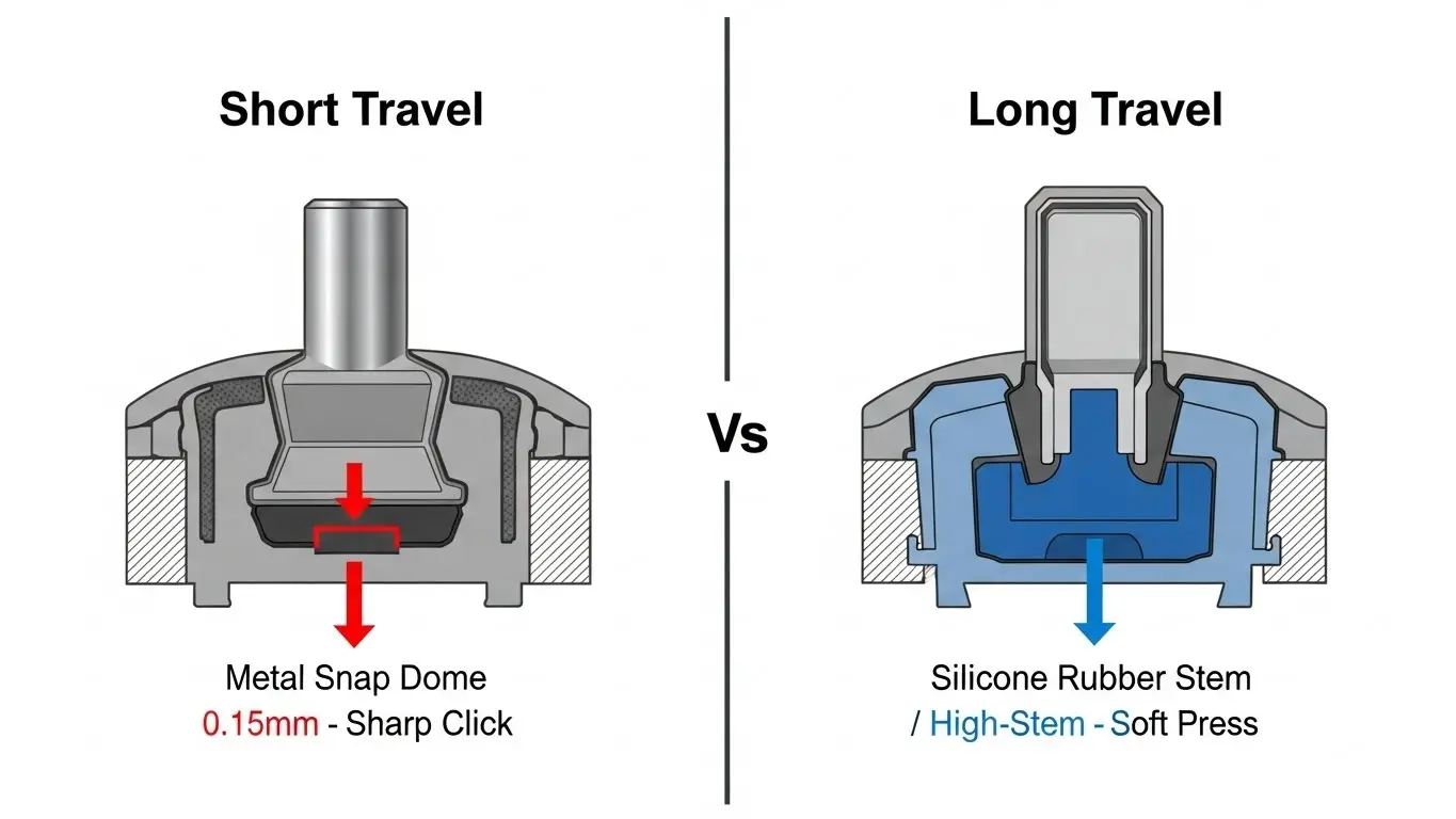 | Feature | Short Travel (Metal Dome) | Long Travel (Rubber/Spring) |